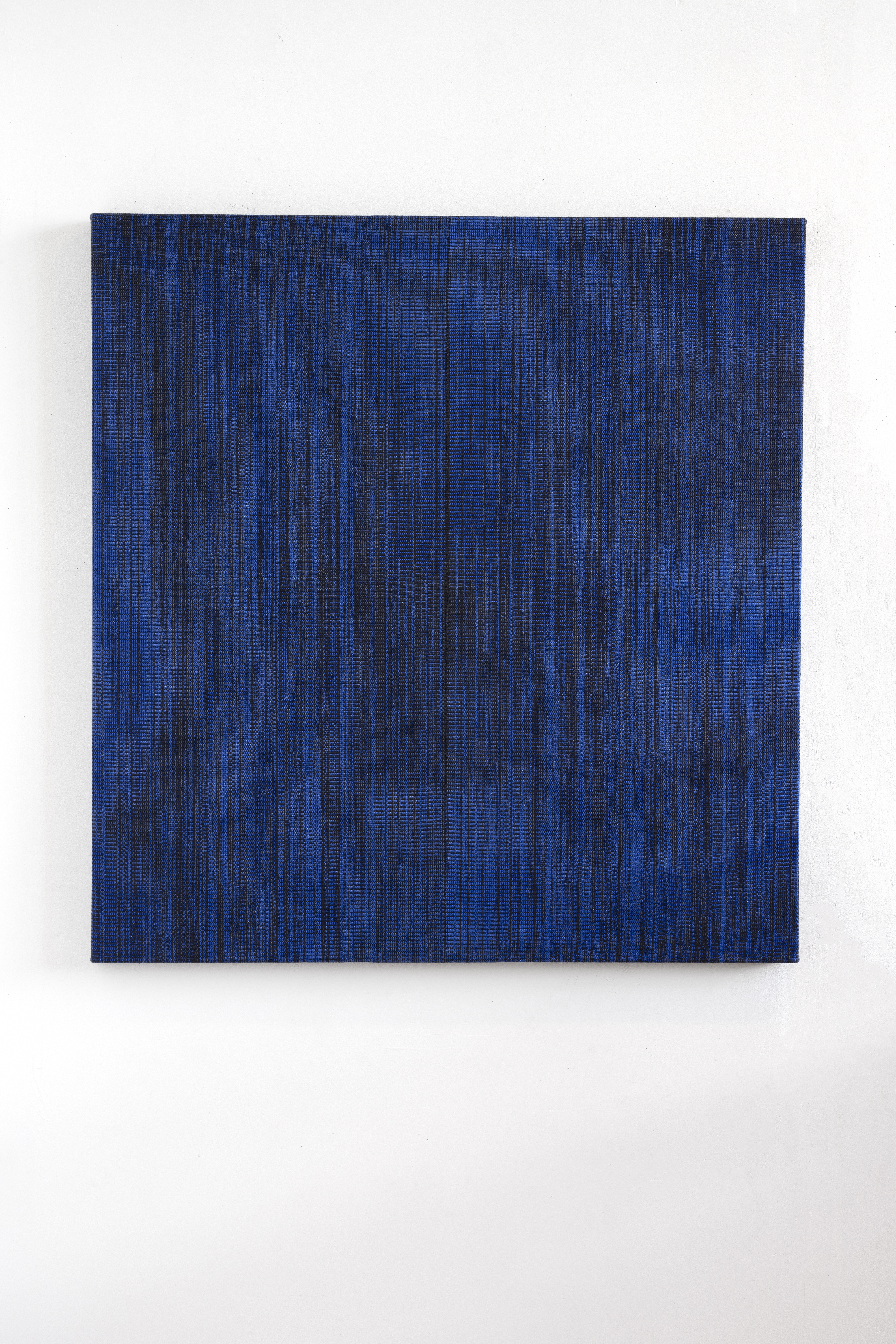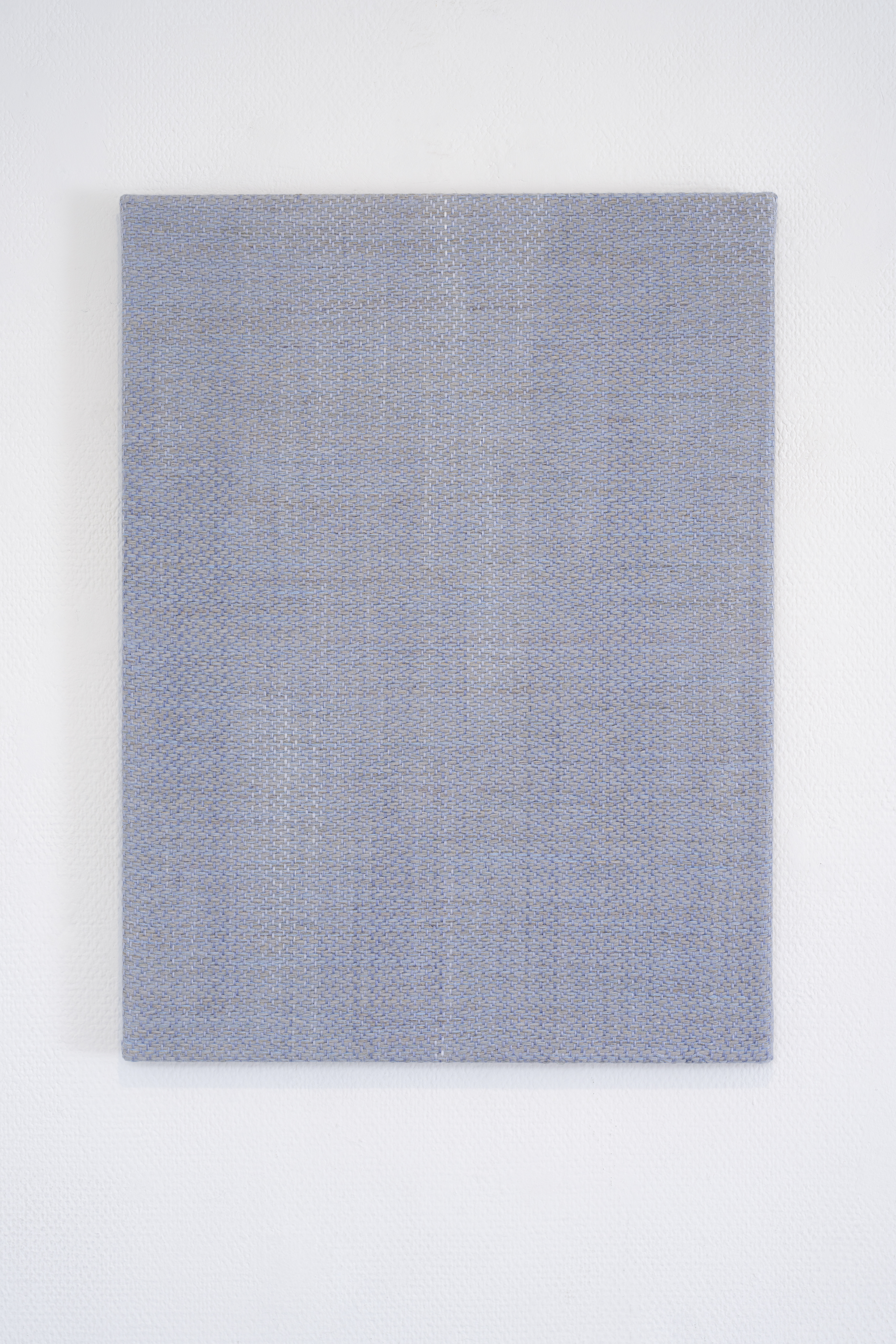 Hand-woven (tabby), hand-dyed linen, hand-dyed wool, mercerised cotton. Installation view: Veiled Accelerations, Detriti Gallery, Gothenburg 2024. Photo: Fredrik Åkum